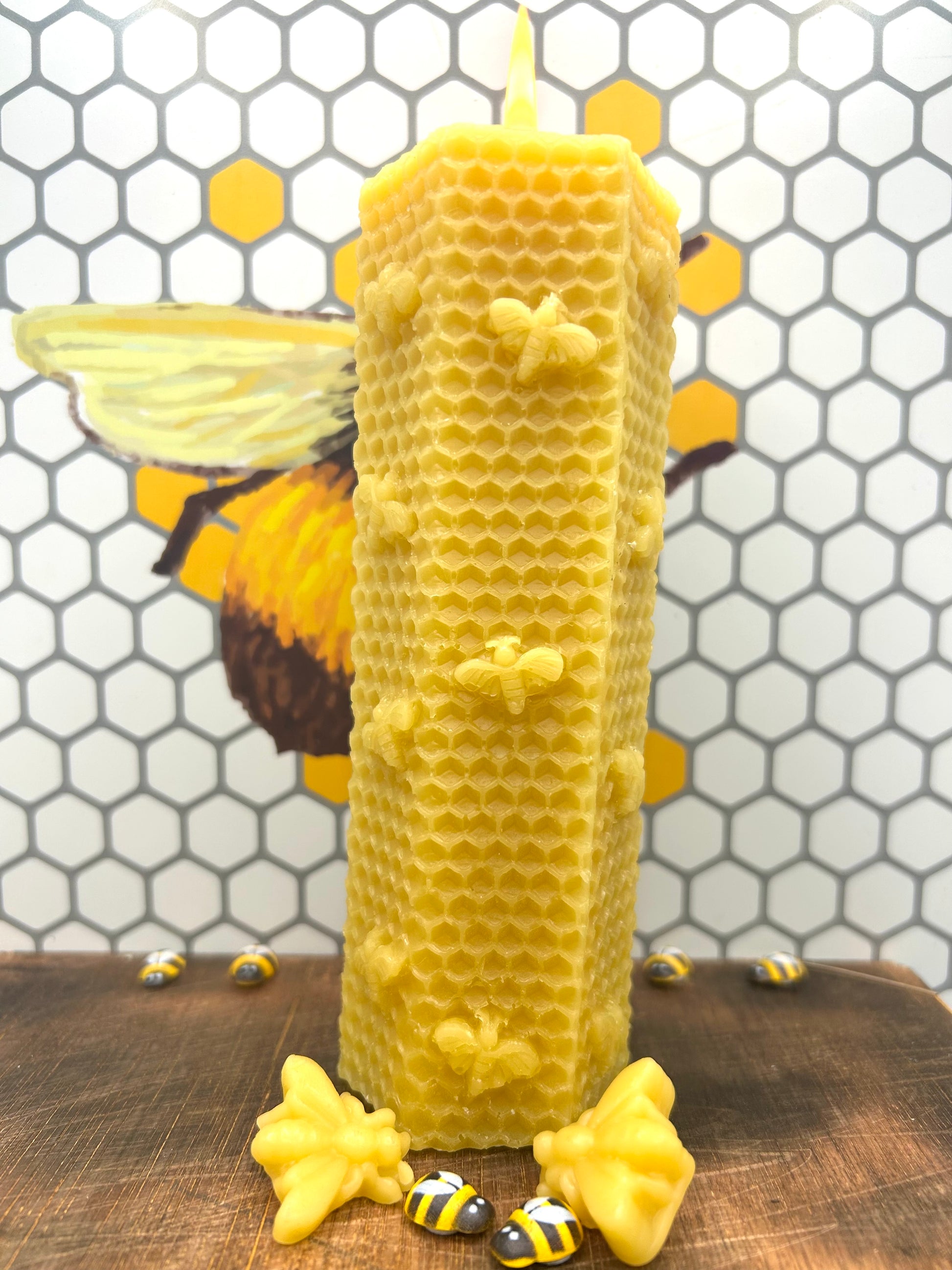 This is the largest beeswax candle in our range, so you’re getting even more 100% pure natural beeswax than ever. The hexagonal honeycomb pattern, decorated with beeswax bees is sure to look fantastic wherever it lives in your home!