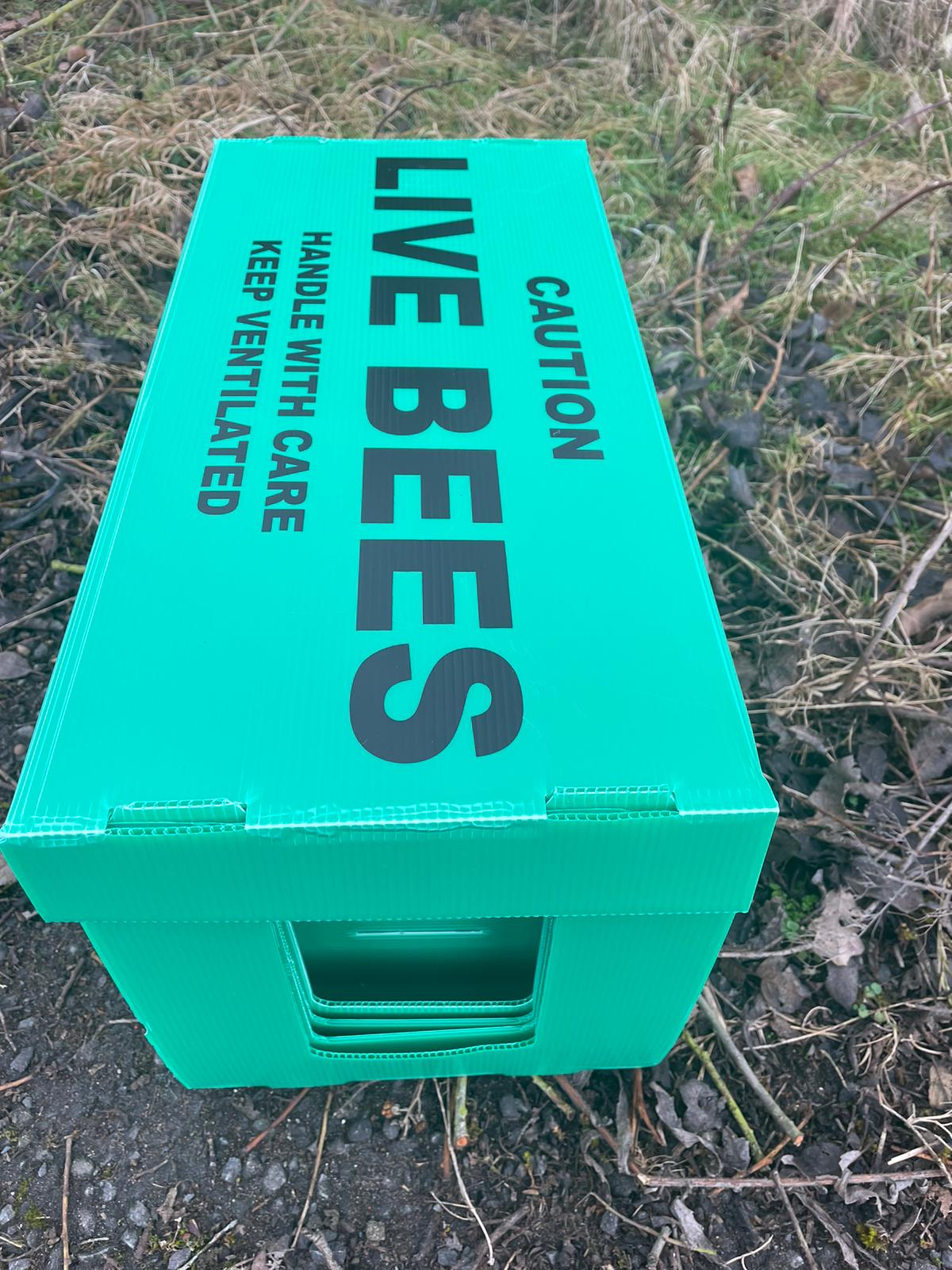 6 frame nucleus of bees and marked Buckfast Queen in a Correx box
