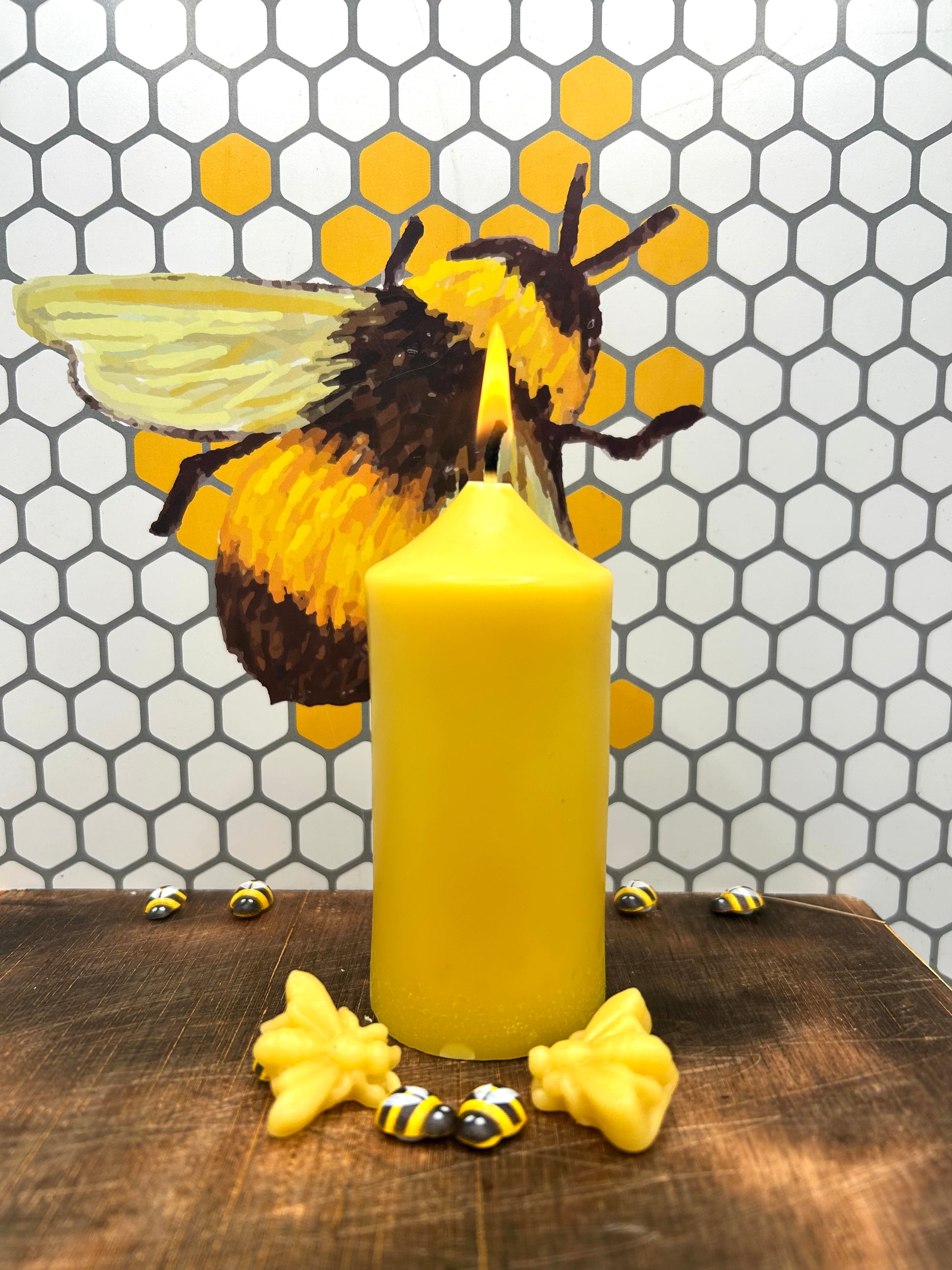 An elegant, small beeswax pillar candle. Beeswax candles don’t just burn cleaner than traditional candles, they also release negative ions into the air; negative ions draw dust out of the air to help you breathe easier 🕯
